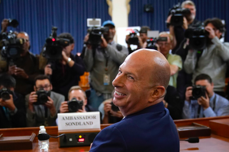 Getty Images Chief Photographer Win McNamee knows his way around Capitol Hill. When U.S. Ambassador and Trump donor Gordon Sondland arrived for his testimony before the House Intelligence Committee on Nov. 20, McNamee was ready to give context to the hearing’s importance by getting behind the star witness and framing him with the crowd of visual media gathered for the standard frontal view. When Sondland cheerfully glanced over his shoulder, McNamee caught the memorable moment preceding a day of damning testimony that implicated top officials in a “quid pro quo” Ukraine scheme.