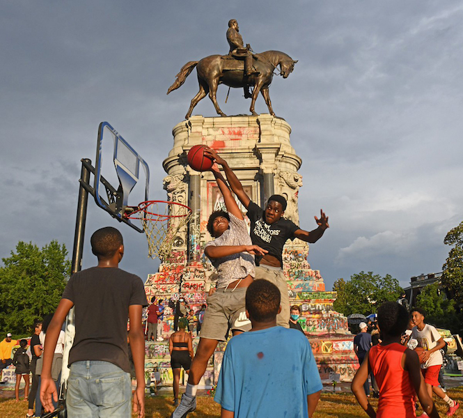 AAt 60 feet, the Robert E. Lee Monument in the center of Richmond is too massive to topple. With its fate now in the courts as lawsuits challenge Virginia Gov. Ralph Northam’s decision to remove the stone-and-bronze statue, the one-time symbol of the Confederate Capital has been transformed by Black Lives Matter protesters into a canvas for graffiti, a performance venue for video projections and gospel concerts, and a makeshift court for pick-up basketball. Style Weekly Photography Editor Scott Elmquist captured the public takeover in a riveting Juneteenth photo that shows Melachi Cobbs in mid-dunk against an attempted block by his cousin, Myles Bradley Cobbs. The peak playground moment amid swirling social change is made even more dramatic against an ominous gray sky, with daylight bouncing off the statue’s transformed base. The vignette is reminiscent of Pulitzer Prize-winning photographer John H. White’s moving photos of Black Chicago life in the 1970s for the Environmental Protection Agency’s DOCUMERICA project. Like White’s masterful photos, Elmquist’s image conveys the everyday life conquest of joy in the moment. | LET YOUR FLAG FLY